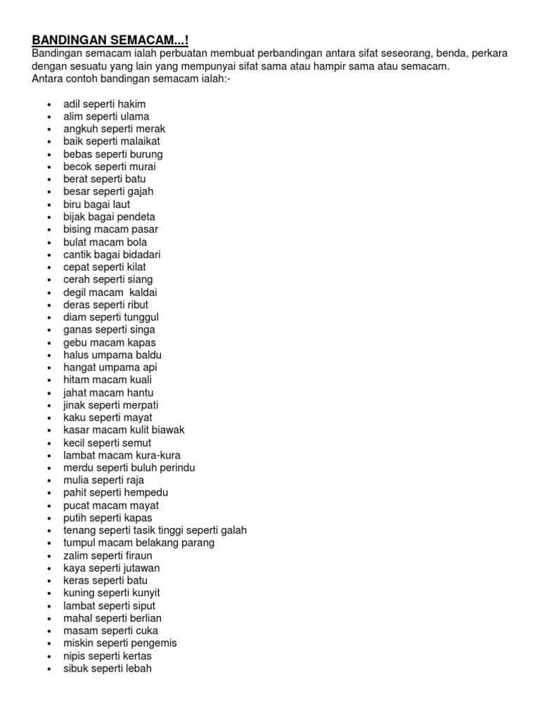 Bandingan semacam add to my workbooks 2 download file pdf embed in my website or blog add to google classroom. Dipakai pada Nomor Surat dan Kalimat. Perbandingan semacam ialah sejenis bahasa kiasan yang menunjukkan sifat keadaan seseorang atau sesuatu benda secara perbandinganPerbandingan semacam pada umumnya digunakan dengan perkataan macam seperti bagai dan laksana BINA AYAT.